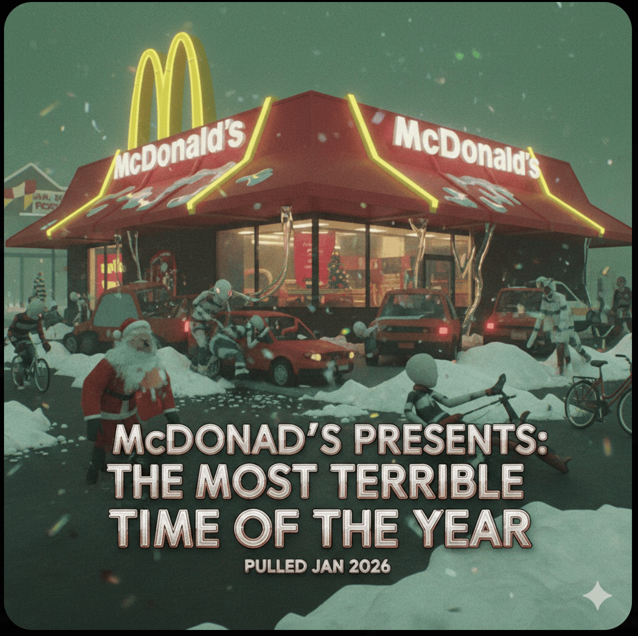 McDonald’s Netherlands foolishly released a fully AI-generated commercial titled "The Most Terrible Time of the Year," which depicted surreal, creepy scenes of Christmas chaos (Santa in traffic jams, cyclists falling in snow). They finally had to pull the ad following a massive social media backlash where users called it "soulless slop." Let’s hope public pressure continues on this type of slop!